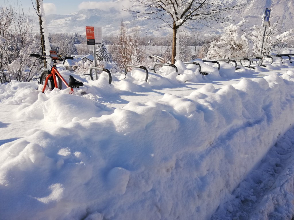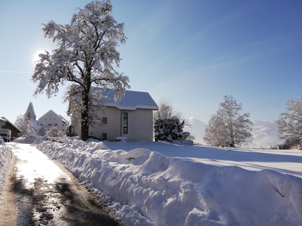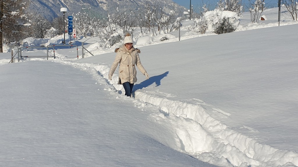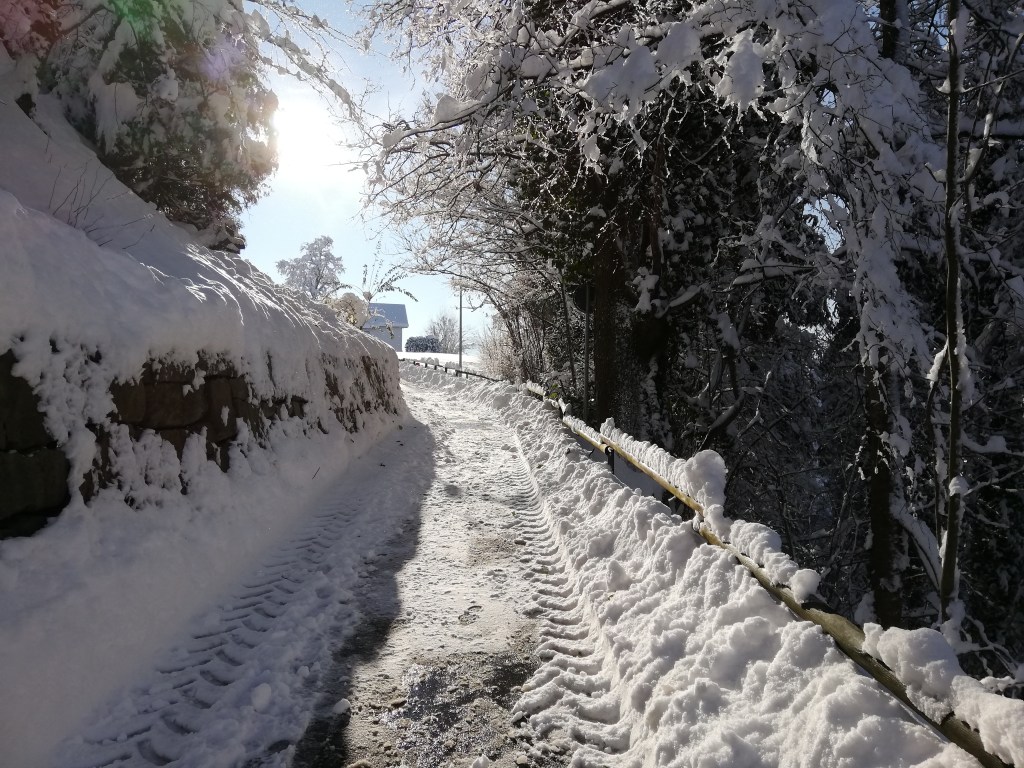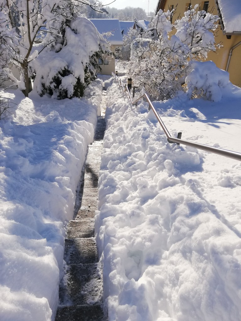 After the heavy snowfall that gave us record amounts of snow in less than two days, we had the most glorious winter day yesterday. Of course, we had to go for a walk through the closer neighborhood. Most of the paths were impossible to walk. In some places, individual people had already tried to make their way through the high masses of snow. It was still a big challenge to follow in the footsteps of the others and to stay stable. The snow cover reached almost to my waist. When walking through the snow, I sank in partly far above my knees. It was fun!