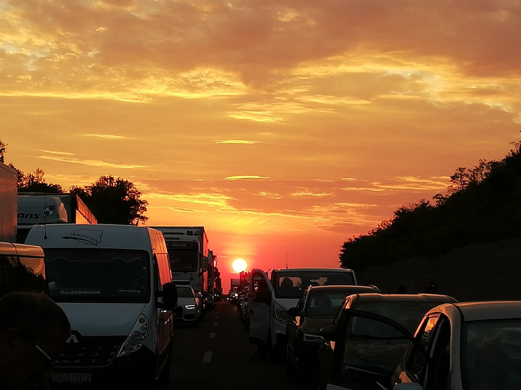 The trip went quite well until about 7.4 km before the exit from the highway. Because of an accident shortly after that exit, everything came to a standstill. Three lanes turned into a huge parking lot. Nothing moved for an hour. Then finally the avalanche of cars started to move slowly. In the end, it took us 2 1/2 hours to cover the 7.4 km. But I’d rather stand in a traffic jam than cause it. And we got a chance to see a stunning sunset.