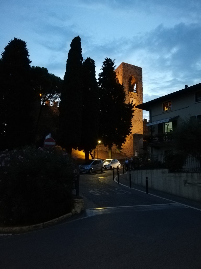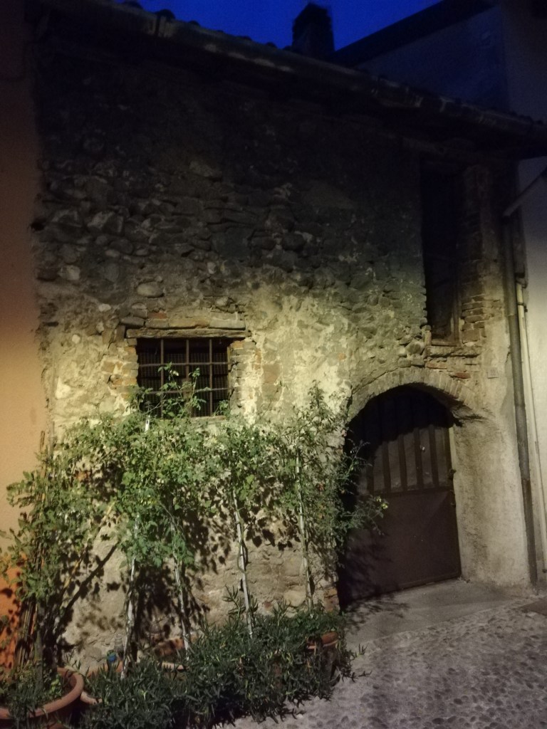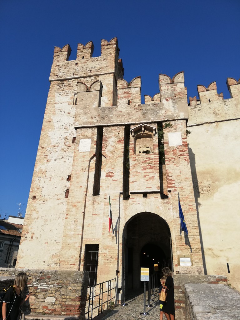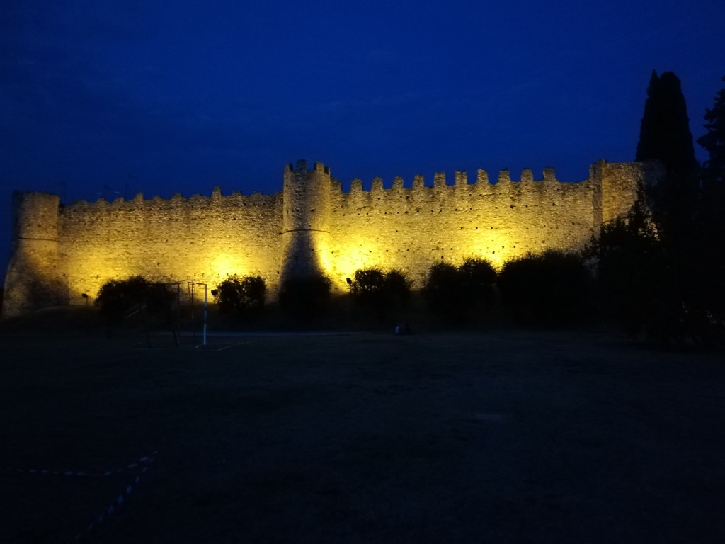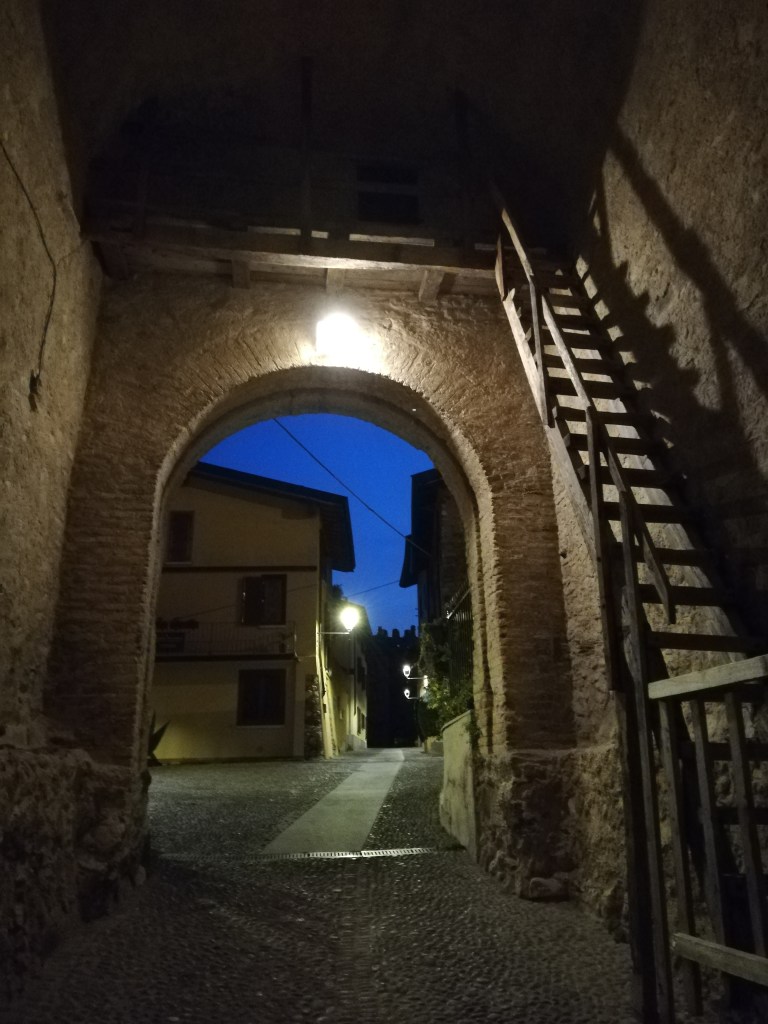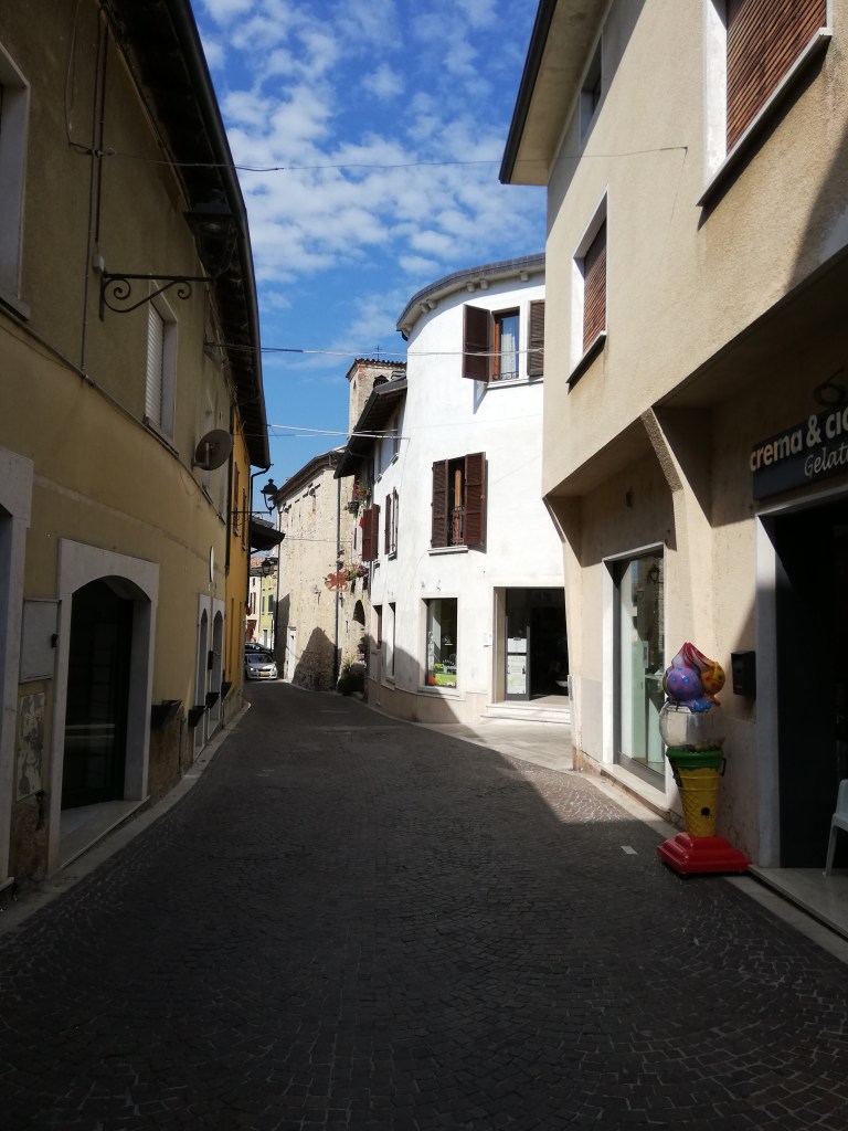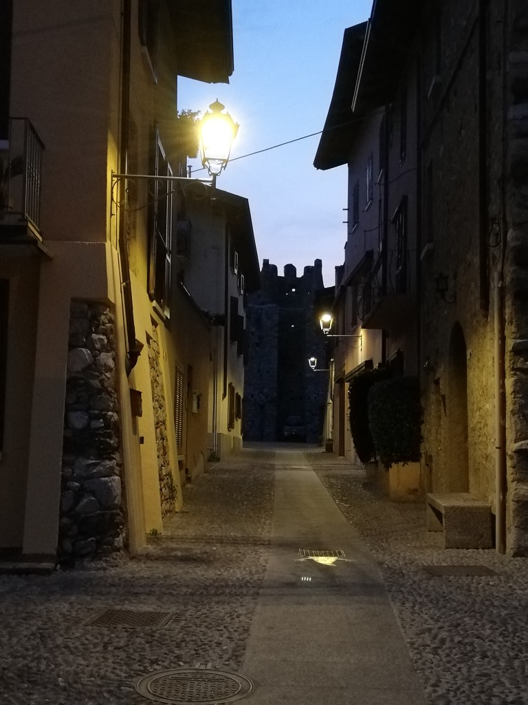 On our last full day at Lake Garda, we chilled by the pool, took another walk along the promenade, and enjoyed a cappuccino at one of the cafeterias. In the early evening, we took the car and drove along the lake to see where we wanted to stop for dinner. We stopped in Moniga del Garda. We had never been there before. It has a small harbor surrounded by restaurants. We left the car at the Rocca di Moniga del Garda. When we parked the car (the small blue one), we didn’t pay much attention to the building. But when we came back, we realized that behind these walls with the clock tower, there is a small medieval town. It looked as if time had stood still there for centuries. In the last photo, you can see why we decided to travel with our little Renault Clio and not with our Dodge Durango.
