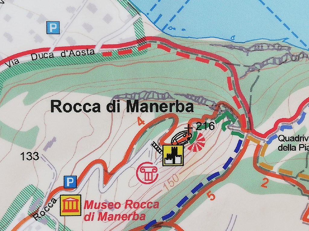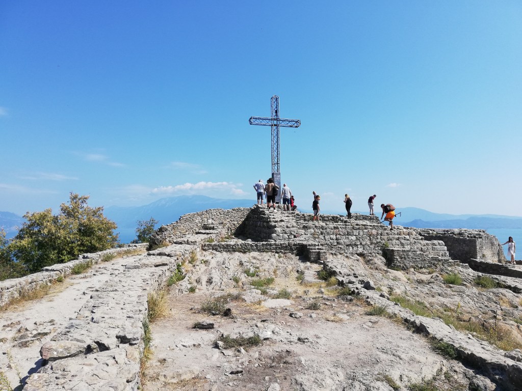 On our first day, we rented bicycles. We rode to the nearby village of Manerba del Garda and up to the Rocca di Manerba. It is an ancient fortress on a hill directly above the lake and town. Later we walked along the promenade from which you can see that hill where the fortress is located.