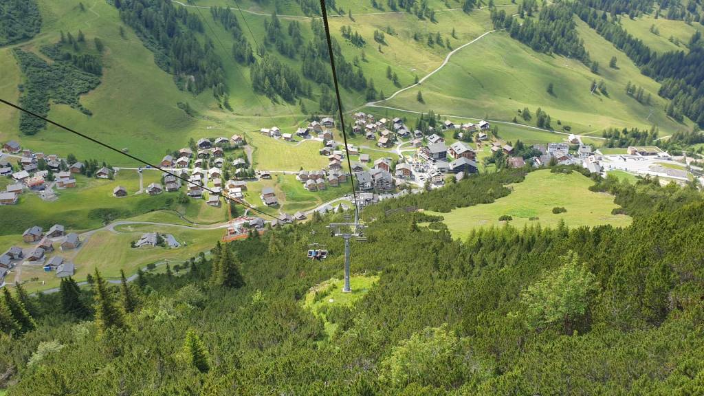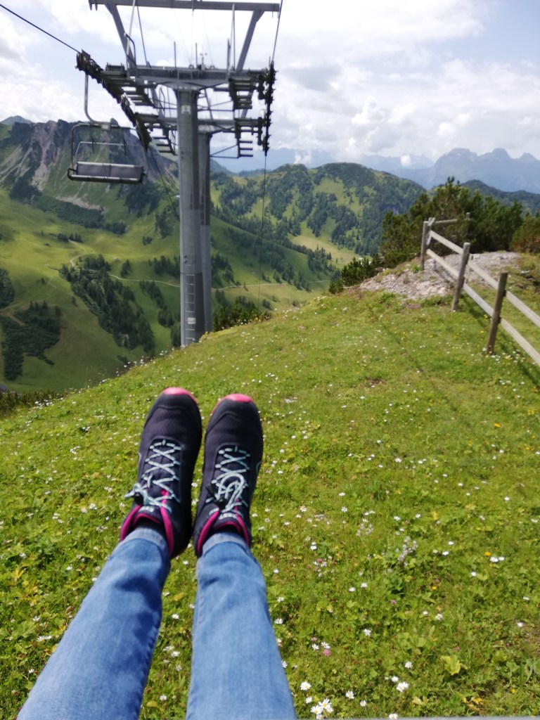 And down we went again. I was joyfully sitting into that chairlift… completely forgetting that I am afraid of heights. After we passed the meadow at the beginning of the ride (as you can see on the photo where I gladly show my feet), the ground disappeared, and I felt like hanging above an abyss. Although basically I knew, I was caught of gard. It was a terrible moment that I cannot even describe. I had not expected my reaction which shocked me too. I managed to keep my panic attack under control but therefore spent half of the ride with closed eyes… lol. So the pictures you see were taken by my husband.