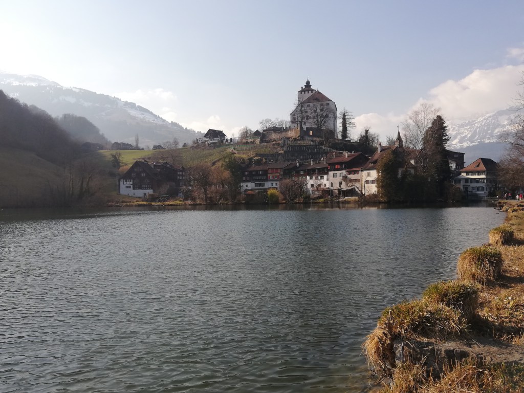 Yesterday, the weather was gorgeous again, although quite cold, and we considered going to the mountains. I needed fresh air and sunshine to recharge my batteries at least a little. However, we knew that skiers would have flooded every little hill, and there would be hardly any free car parking, but crowded alps instead. We decided to walk around a small lake that belongs to a small medieval town, which is only about 10 minutes away from us by car. Once there, we couldn’t resist walking through the beautiful town as well, and up to the castle.